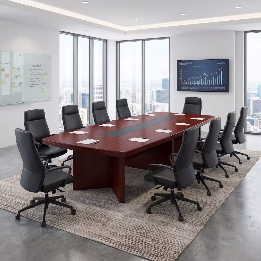 Crafted with commercial-grade materials and finished in a rich mahogany tone, the table delivers a strong executive presence while ensuring long-term durability for everyday business use. The expansive tabletop provides ample space for laptops, documents, conferencing equipment, and meeting accessories, supporting efficient and organized meetings.