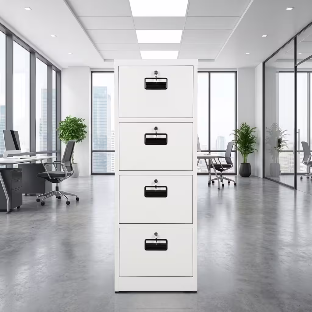 A lockable 4 drawer office filing cabinet with durable steel construction, smooth drawers, and space-saving vertical design—ideal for secure document storage.